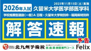 お知らせ 予告:【2026入試】久留米大(医-医)学校推薦型選抜【解答例】 2025年11月15日(土)実施の久留米大学医学部医学科学校推薦型選抜(一般)A日程・久留米大学特別枠・福岡県特別枠の解答速報は11月15日17時頃に公開予定です! 2025.11.13 お知らせ