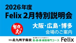 お知らせ【Felix】医進系少人数制コース 大阪・広島・博多特別説明会のご案内【特別説明会】 北九州予備校では、 3月より各校舎及び各特設会場にて選抜試験と併せて学校説明会を開催しています。 特に近年では関西・中国・四国地区の方から医学部受験のご相談やお問い合わせが多いことから、Felix校舎では特別に、 大阪及び広島に会場を設け、 学校説明会と北予備が誇るプロの講師による学習アドバイスを行います。 2026.01.28お知らせ