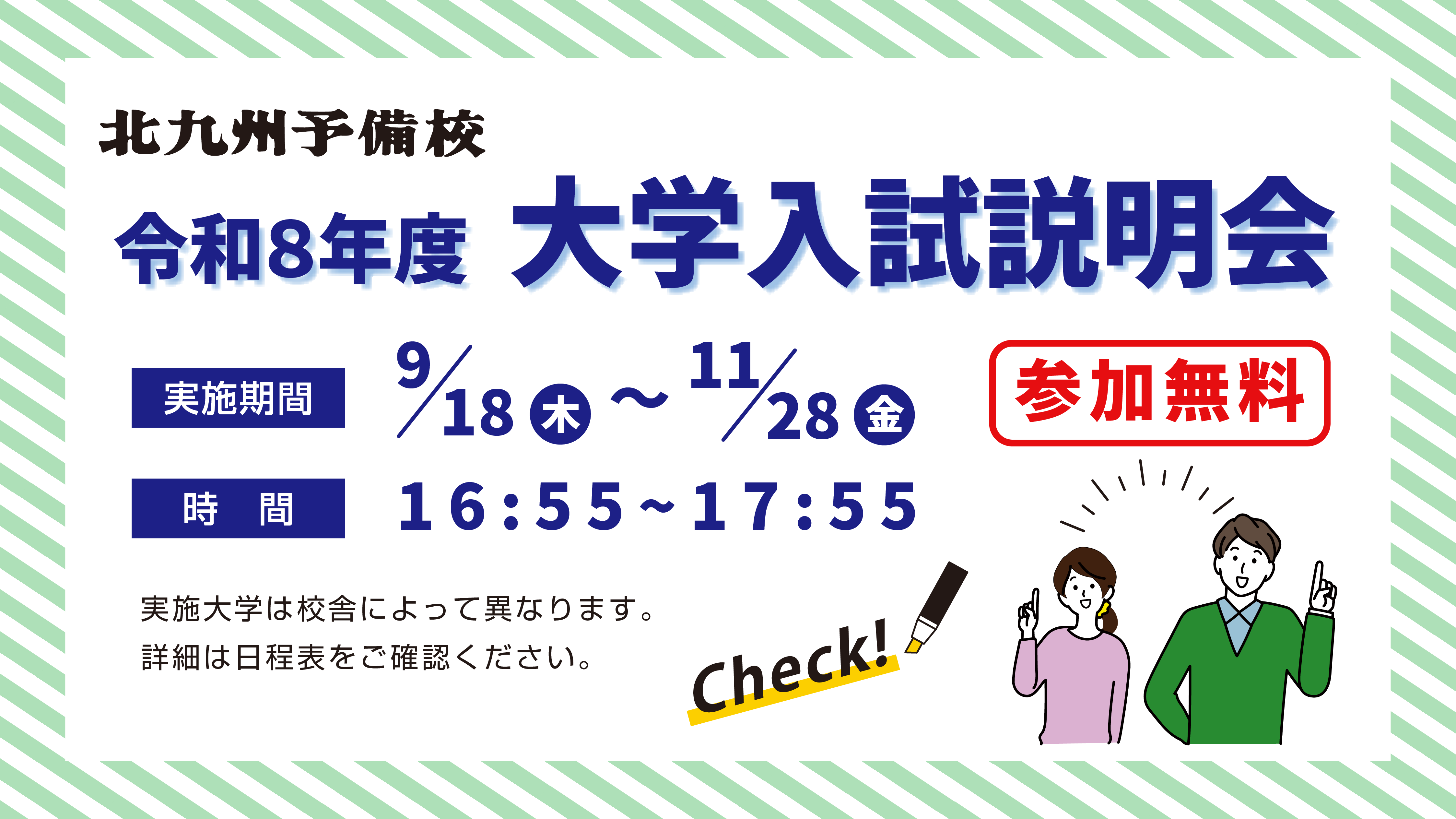 北九州予備校の各校舎で大学入試説明会を開催します。大学の入試担当者や教授より、大学の様子・入試制度・入試問題の傾向などを講演形式でお話いただきます。高校生や保護者の方もご参加いただけます。お気軽にお越しください!
