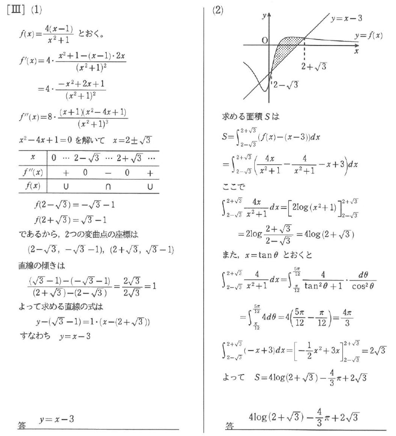 後半の数学Ⅲの記述問題は分数関数の微分と定栢分の計算を日頃から練習をしていれば昨年の記述問題より解きやすかったと思われる。目標得点率60%